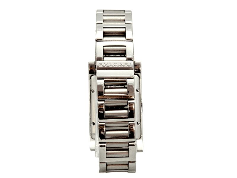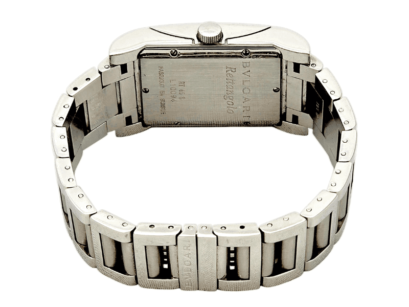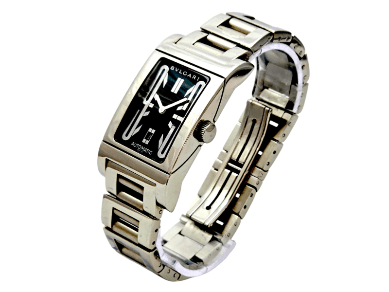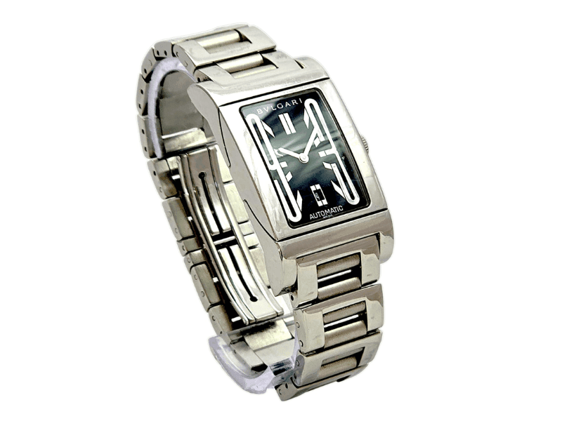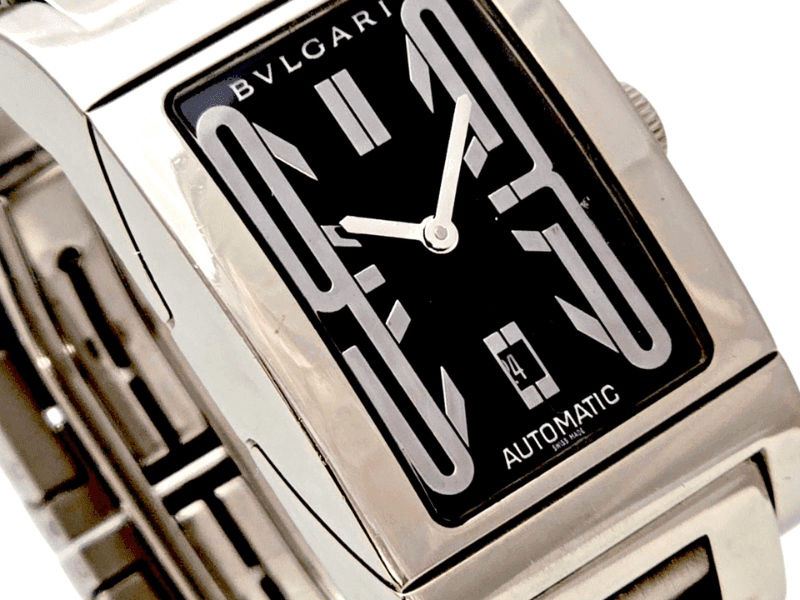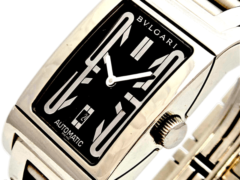 O Bvlgari Rettangolo Automático é uma peça atemporal que combina o requinte da relojoaria suíça com o design ousado e moderno da escola Art Déco. Seu formato retangular, pulseira em aço e mostrador preto imponente fazem deste relógio um clássico contemporâneo – ideal para quem aprecia linhas refinadas e personalidade marcante.