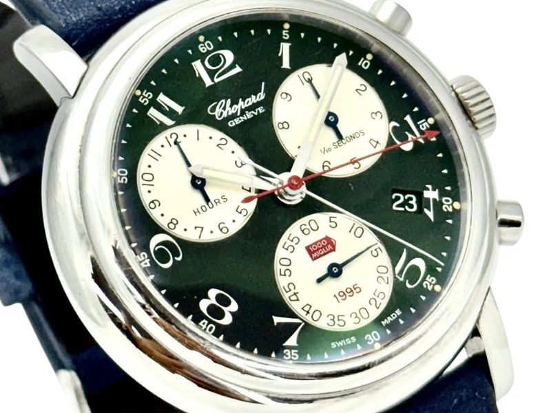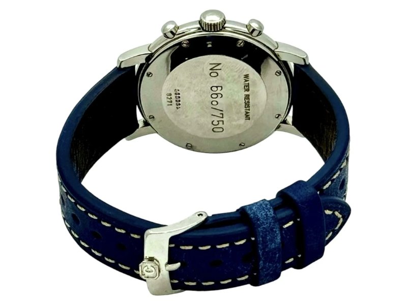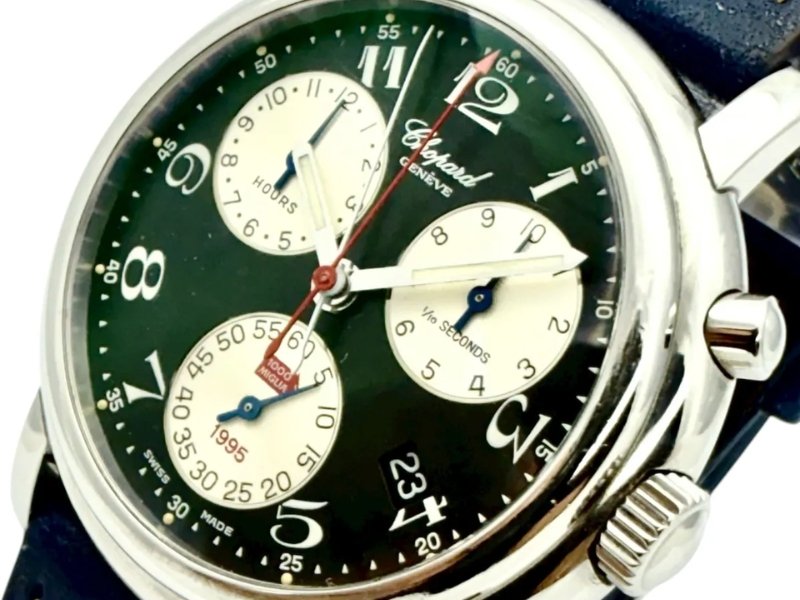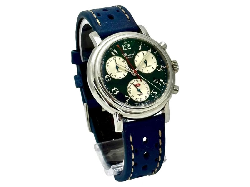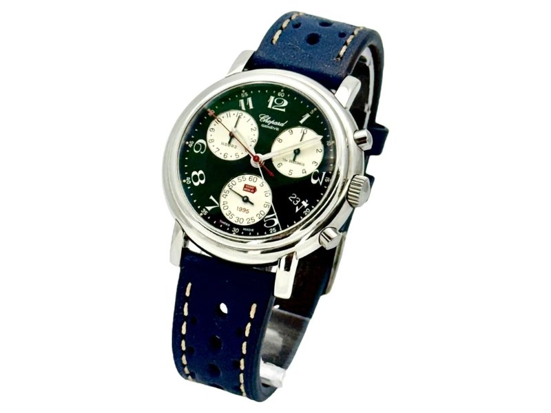 A caixa de 39mm em aço inoxidável abriga um mostrador preto estilo panda com subdials brancos, numerais arábicos e cristal de safira resistente a riscos. O movimento quartzo garante precisão e confiabilidade, enquanto a pulseira artesanal em couro azul com fivela original Chopard adiciona sofisticação e autenticidade.