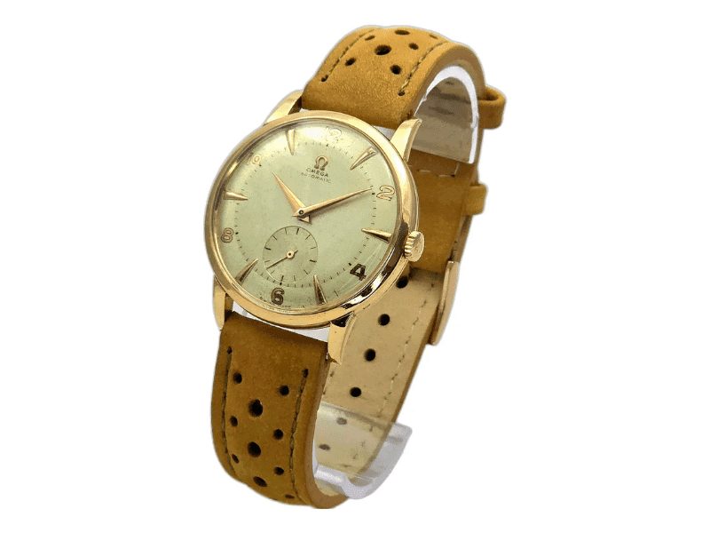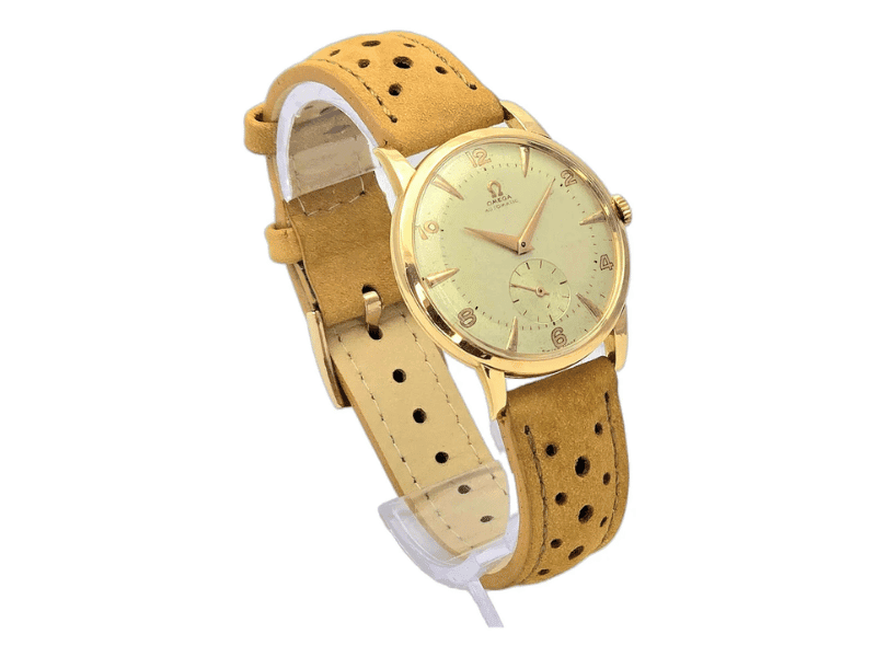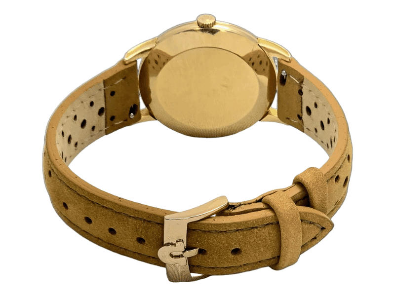 A pulseira em couro marrom-claro perfurado complementa o visual com conforto e estilo. Este Omega é mais que um acessório: é um investimento em história, arte e tradição.