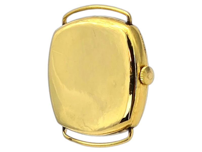 A caixa almofadada em ouro amarelo 18k (marcação 0.750) confere sofisticação e valor colecionável. O mostrador esmaltado branco com algarismos arábicos pretos e ponteiros “cathédrale” preserva o estilo art déco da época, com subdial de segundos às 6h.
