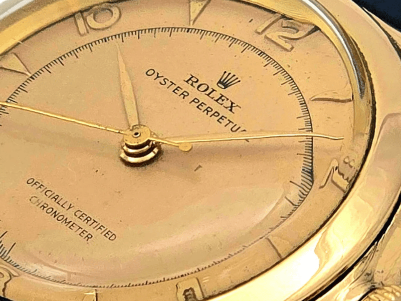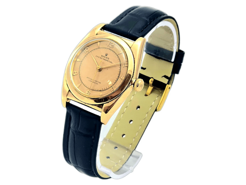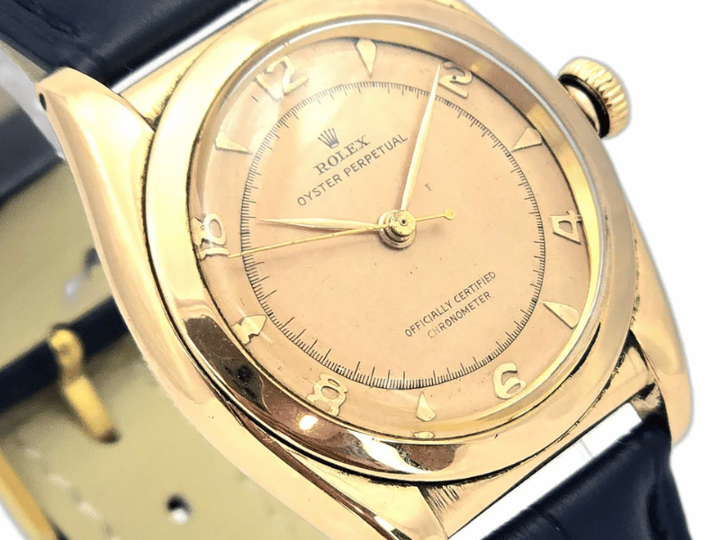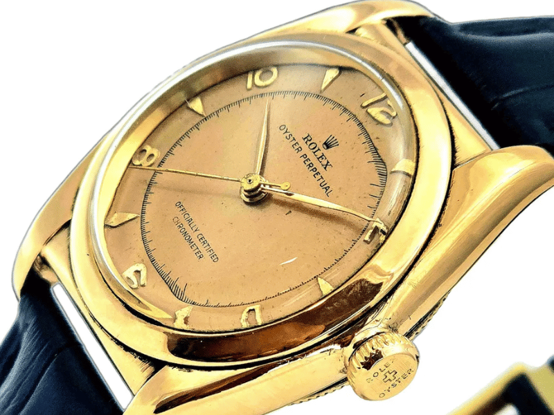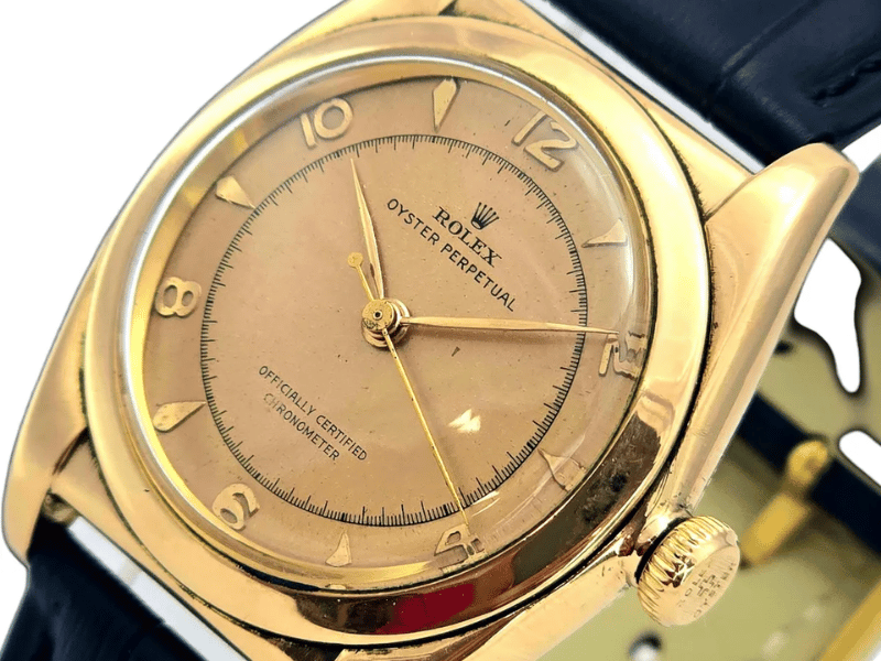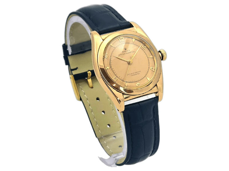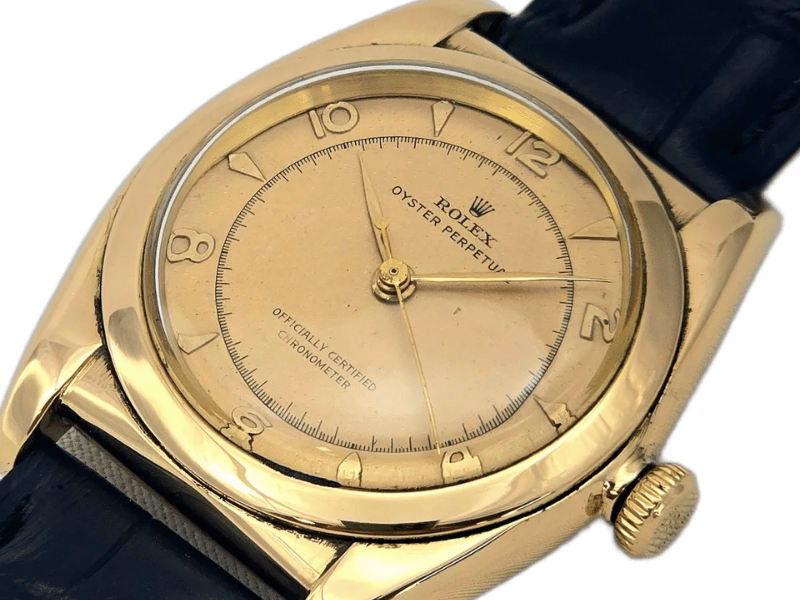 O Rolex Oyster Perpetual Bubbleback Ref. 3131 é uma peça rara e histórica, produzida em 1954, que representa a transição entre os primeiros cronômetros automáticos da Rolex e os modelos contemporâneos. Com sua tampa traseira arredondada — o famoso “bubble” — este relógio foi projetado para acomodar o pioneiro movimento automático da marca.